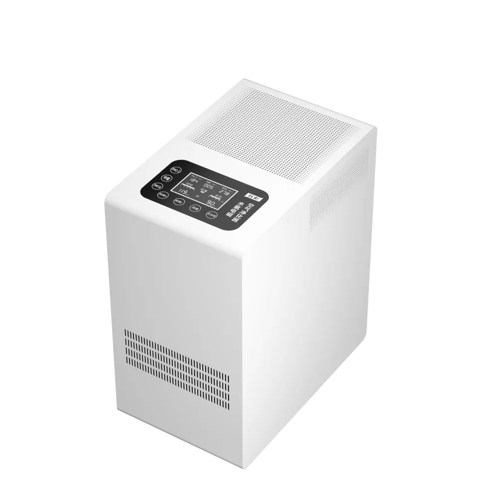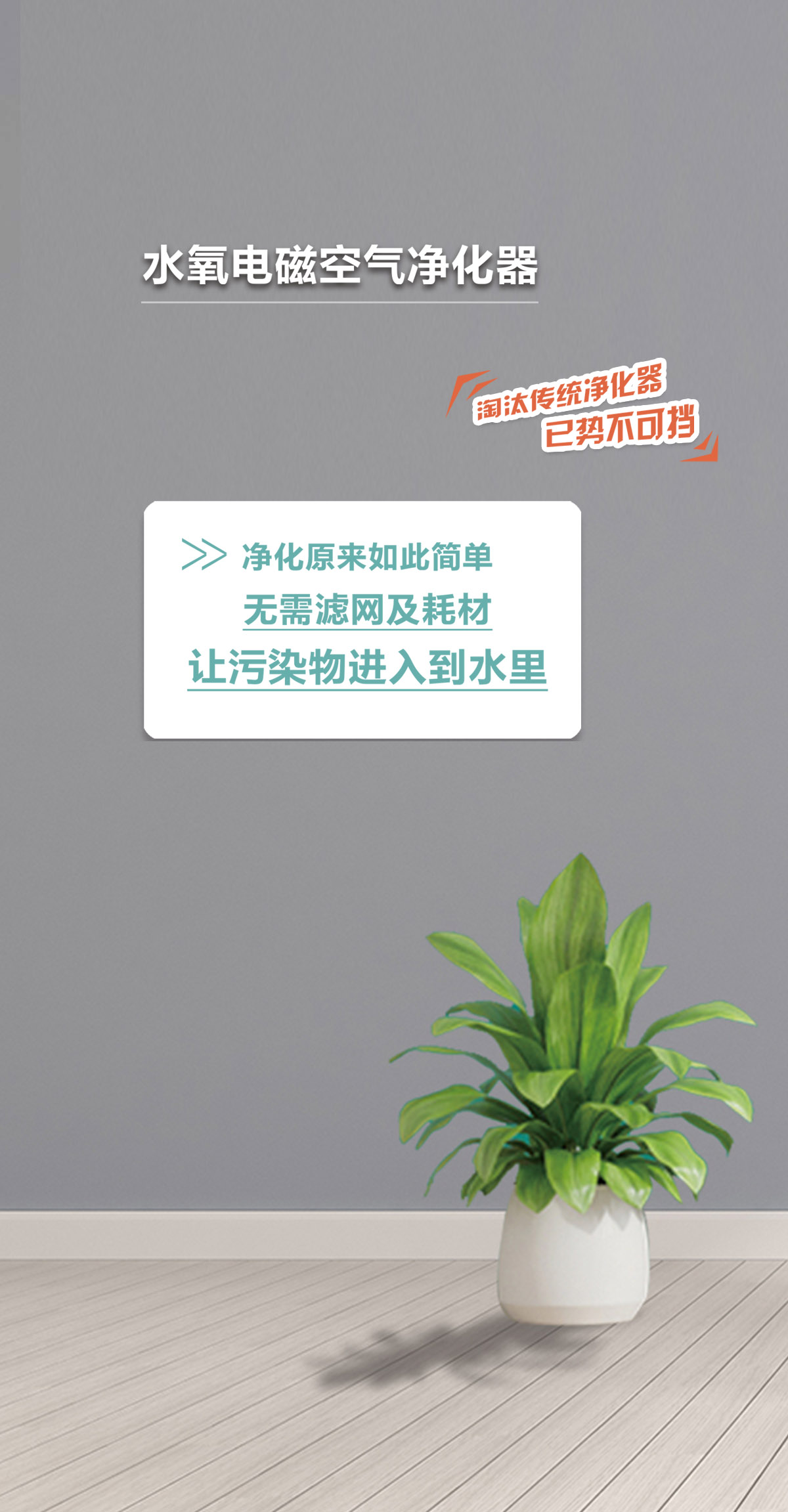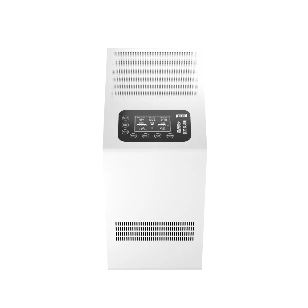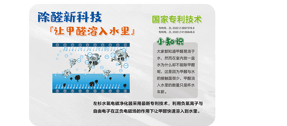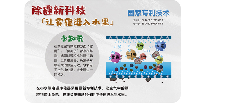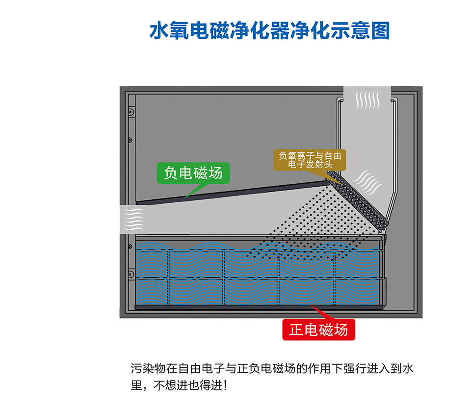 空气中颗粒物污染物pm2.5等及化学污染物甲醛等,在经过净化器时在自由电子的作用下而带上负电,再由正负电磁场的共同作用下会快速进入到水里,细菌病毒微生物等会被电离而死,再进入到水里,无需滤网及耗材将三态污染一网打尽,已获得国家知识产权局多项专利。